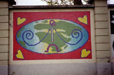 ARTIST: Sergio Fabio Rotella LOCATION: Milan Central Dairy at the intersection of Viale Toscana & Via Castelbarco DESCRIPTION: This mosaic is made from Bisazza glass tiles in 1998. The original concept of surrounding the dairy came from the designer, Sergio Fabio Rotella. Each image was created using CAD graghics and then reproduced by Bisazza. Where possible, I have tried to match the image with the artist/designer from information contained in the 1st AnnualBisazza book/catalog. However, not all 28 artists information is available to match up with all the photos. CONTRIBUTOR: Richard Davis - Washington, USA |