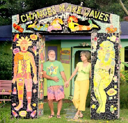 DESCRIPTION: ' X 8' MOSAIC COVERED ARCH IN FRONT OF HOUSE: "CHANGES MAKE WAVES"